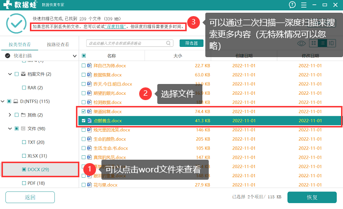 第三步:再快速扫描找齐你需要恢复的文件,如果没有找齐,就通过二次扫描来搜索更多数据(无特殊情况可以忽略)。选择所有要恢复的文件,再选择【恢复】。