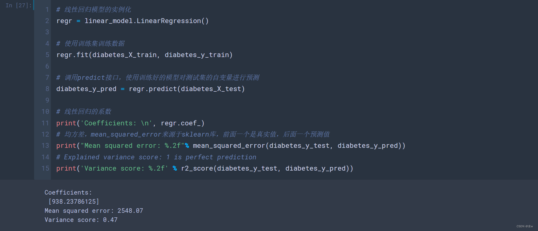 mean_squared_error(diabetes_y_test, diabetes_y_pred)),均方误差,(真实值-预测值)之差->平方->求和->平均。即线性回归的损失函数,这个损失函数越小越好。