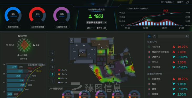 智慧商场系统可提供室内地图数据,以及二三维地图应用开发,并结合BIM、数字孪生、大数据等技术搭建全流程专业技术产品与服务,实现商场内部铺位管理、楼宇自动化管理、设备追踪等管理系统,集成统一化发展,建立成熟的EAM管理应用界面。系统包含商场单元可视化分析系统、商场客流分析系统、公寓前台管理系统、日常经营分析系统,利用室内地图展示商场客流数据和顾客行为数据,利用统计图、热力图、轨迹等方式展现;日常经营分析系统包含营业额统计分析、店铺营业额对比分析、租期甘特图预警以及会员位置分析。