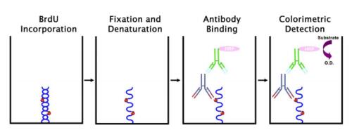 该试剂盒检测掺入细胞DNA的BrdU在使用抗BrdU抗体的细胞增殖期间。当细胞在含有BrdU,嘧啶类似物取代胸苷被并入新合成的DNA中增殖细胞(下图)。一旦去除标记介质,细胞就被固定,DNA就被用固定/变性溶液一步变性(需要变性DNA以改善并入的BrdU用于检测的可接近性)。然后是抗BrdU小鼠单克隆抗体加入抗体,然后加入HRP缀合的二级抗体以检测掺入的BrdU。显影颜色的吸光度大小与BrdU的量成正比并可与细胞增殖直接相关。