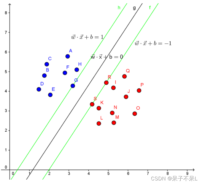 Support Vector Machine。支持向量机,其含义是通过支持向量运算的分类器。其中“机”的意思是机器,可以理解为分类器。 那么什么是支持向量呢?在求解的过程中,会发现只根据部分数据就可以确定分类器,这些数据称为支持向量。 见下图,在一个二维环境中,其中点R,S,G点和其它靠近中间黑线的点可以看作为支持向量,它们可以决定分类器,也就是黑线的具体参数。