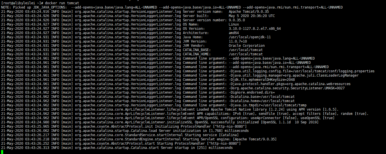 发现咱运行后 出现tomcat 默认占用的8080 端口 说明该镜像已经是启动了 ,但是 咱好像鼠标没有回到咱服务器上了 ,这怎么办呢 ?