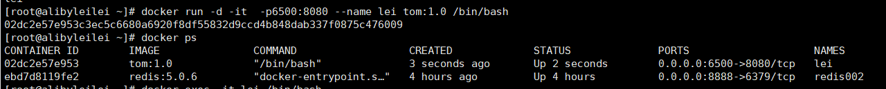 docker run -d -it -p6500:8080 --name lei tom:1.0 /bin/bash