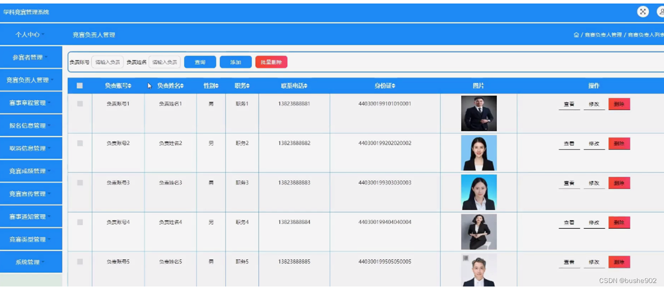 赛事负责人管理,在赛事负责人管理页面,可以对负责账号、负责姓名、性别、职务、联系电话、身份证、图片等进行查看、修改、删除或添加、批量删除等操作。如图5-9所示。
