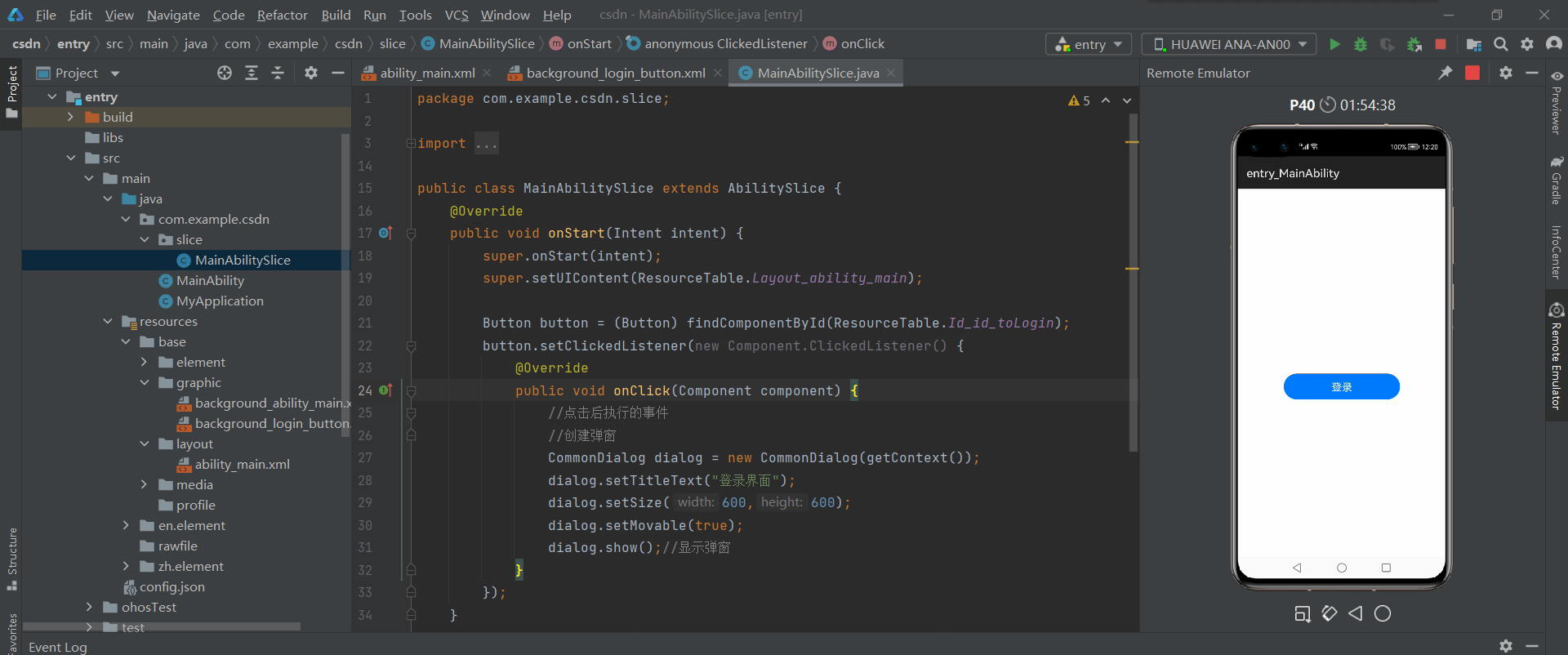 Button button = (Button) findComponentById(ResourceTable.Id_id_toLogin);button.setClickedListener(new Component.ClickedListener() {@Overridepublic void onClick(Component component) {//点击后执行的事件//创建弹窗CommonDialog dialog = new CommonDialog(getContext());dialog.setTitleText("登录界面");dialog.setSize(600,600);dialog.setMovable(true);dialog.show();//显示弹窗}});}