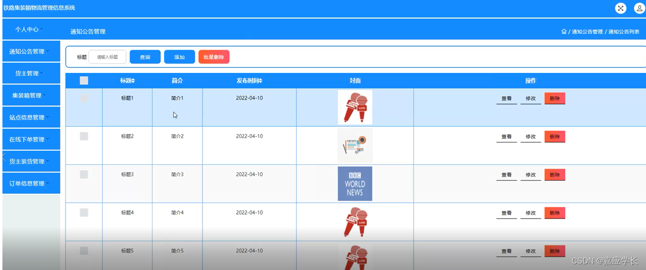 通知公告管理,在通知公告管理页面可以查看标题、简介、发布时间、封面等信息,并可根据需要进行修改、删除等操作,如图5-3所示。