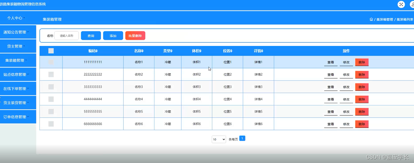 集装箱管理,在集装箱管理页面可以查看编码、名称、类型、体积、位置、详情等信息,并可根据需要进行修改、删除等操作,如图5-5所示。