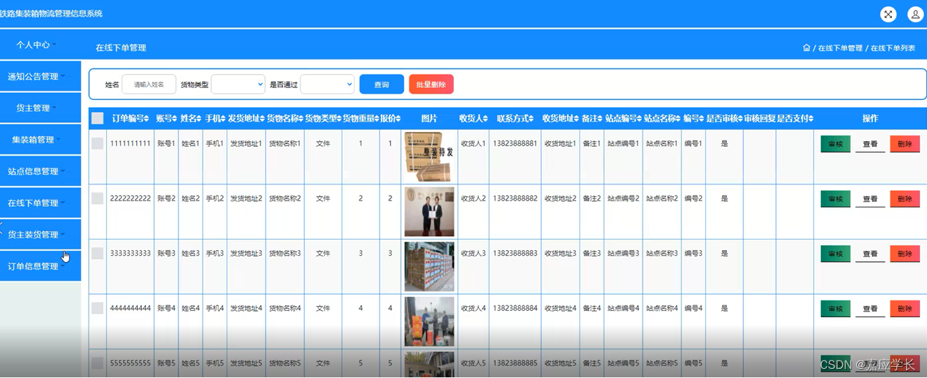 在线下单管理,在在线下单管理页面可以查看订单编号、账号、姓名、手机、发货地址、货物名称、货物类型、货物重量、报价、图片、收货人、联系方式、收货地址、备注、站点编号、站点名称、编码、是否审核、审核回复、是否支付等信息,并可根据需要进行审核、删除等操作,如图5-7所示。