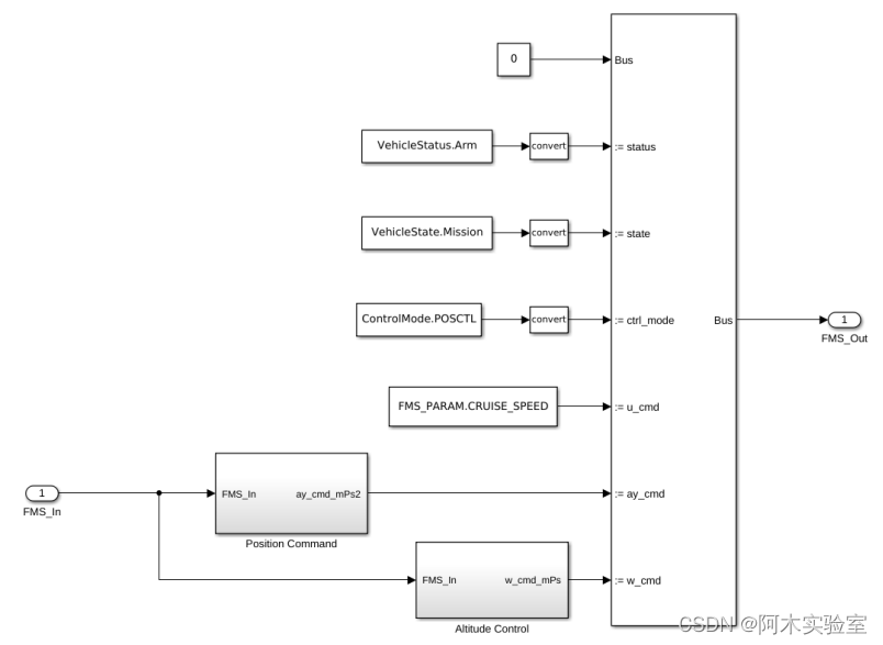 FMT固定翼航点飞行功能主要在FMS(飞行管理系统)中实现,其算法模型主要包含两个部分,分别为状态机(FMS State Machine)和指令生成器(FMS Commander)。