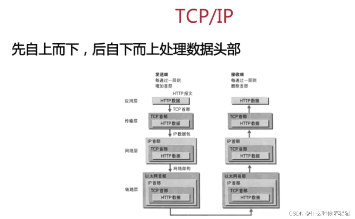 从应用层开始呢,都会对要传输的数据头部进行处理,加上本层的一些信息。最终由物理层通过以太网,电缆等介质将数据解析成比特流,在网络中传输。数据传递到目标地址并自底而上