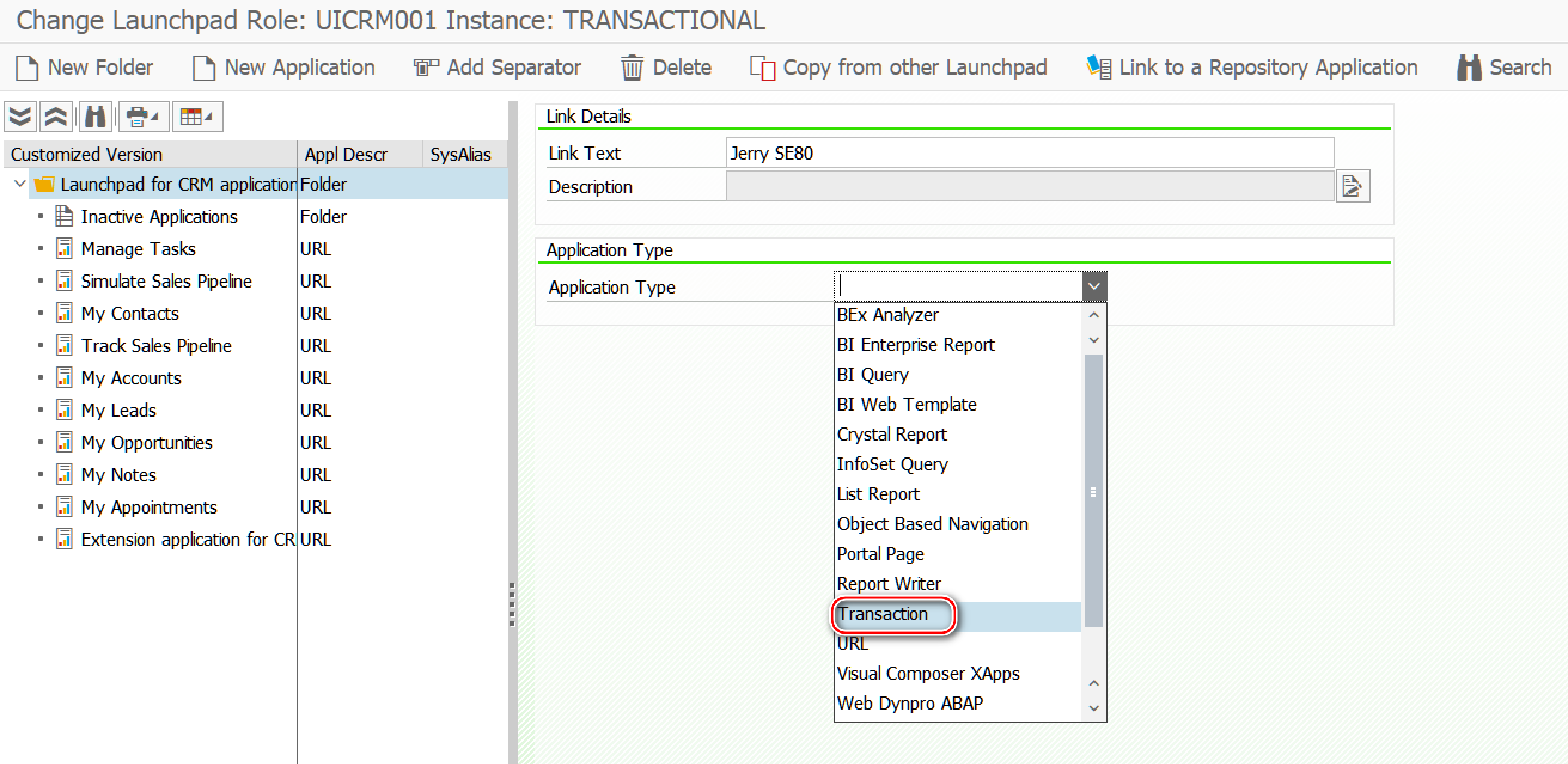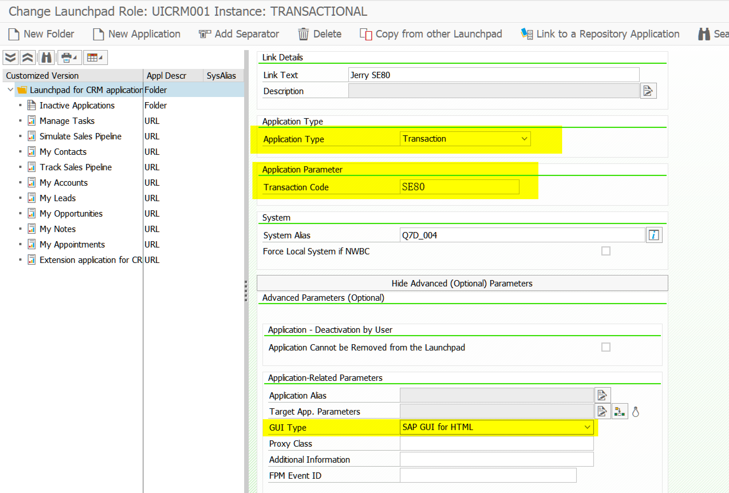 维护 Application Type 为 Transaction,Transaction Code 为 SE80,并制定 System Alias:
