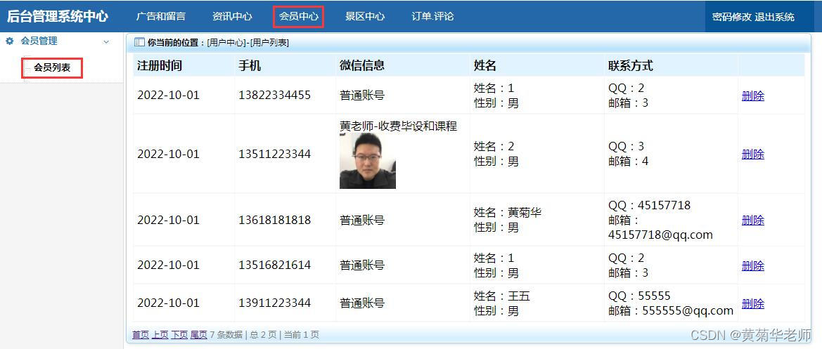 会员列表:查看所有注册会员信息,支持删除