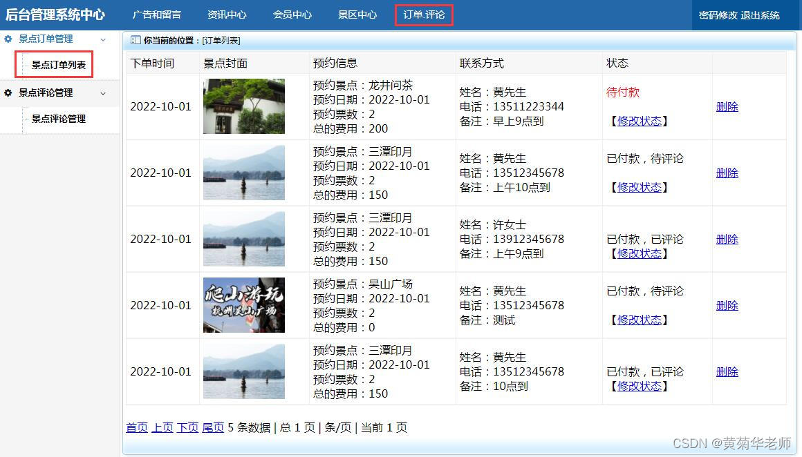 景点订单列表:查看所有用户下单的景点预约订单信息,支持删除