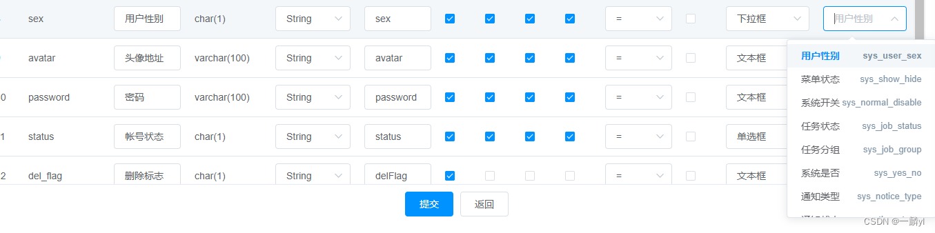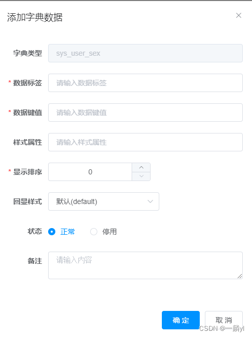 - 字典类型:这里需要注意的是在定义类型的时候不能乱来,这里定义的类型不能与已经有的类型重复,否则会报冲突异常,并且在定义类型的时候要有一定的规范,如果你不想定义的太复杂,这里建议使用(表名+字段) ,如用户性别sys_user表中的性别sex,写成sys_user_sex就行了