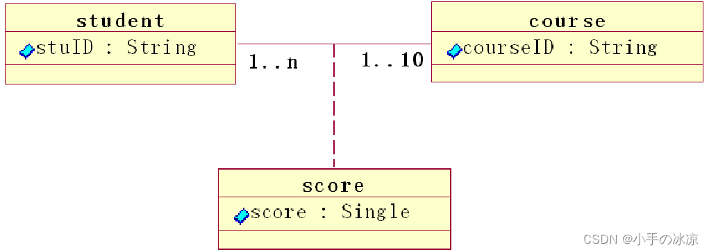 - 在应用当中,如果发现两个类之间具有多对多的关系,并且有些属性不属于关联两端任何一个类