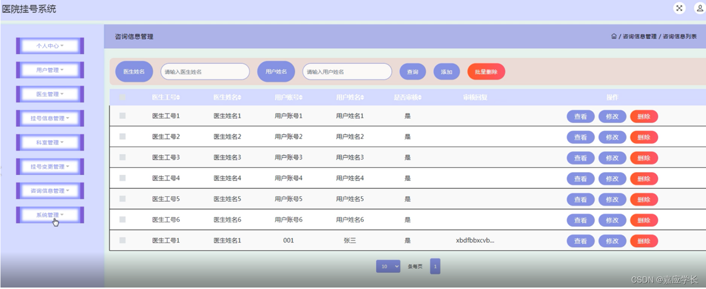 系统主要包括个人中心、用户管理、医生管理、挂号信息管理、科室管理、挂号变更管理、咨询信息管理、系统管理等功能模块。
