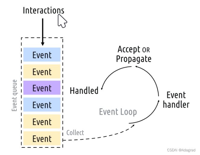与应用程序的每一次交互——无论是按键、鼠标点击还是鼠标移动——都会生成一个事件,并将其置于事件队列中。在事件循环中,每次迭代都会检查队列,如果发现等待事件,则会将事件和控制传递给事件的特定事件处理程序。事件处理程序处理该事件,然后将控制传递回事件循环以等待更多事件。每个应用程序只有一个正在运行的事件循环。