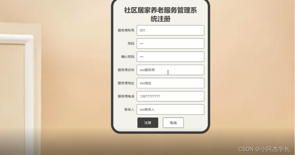 服务商注册,在注册页面填写服务商账号、密码、确认密码、服务商名称、服务商地址、服务商电话、联系人等详细信息进行注册,如图5-1所示。