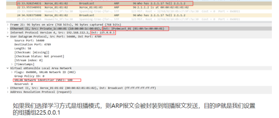 ●VTEP-A收到VM发送的 ARP请求,此时 VTEP-A还没有VM对应的地址映射表项, VTEP-A将 ARP请求进行 VXLAN封装, VNI 设置为100,outer-src-ip 是 IP-A,outer-dst-ip 是加入的组播组地址,封装完成后转发至 VXLAN组播组(可以选择单播学习,单播到VTEP Peer)
