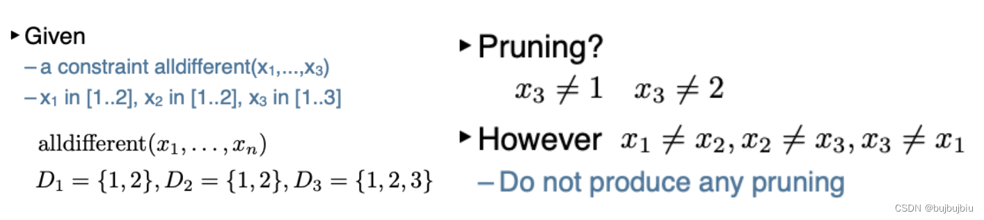 从全局约束角度:可得x3 ≠ 2。从元素约束角度:对每一个约束,并不能缩小搜索空间。