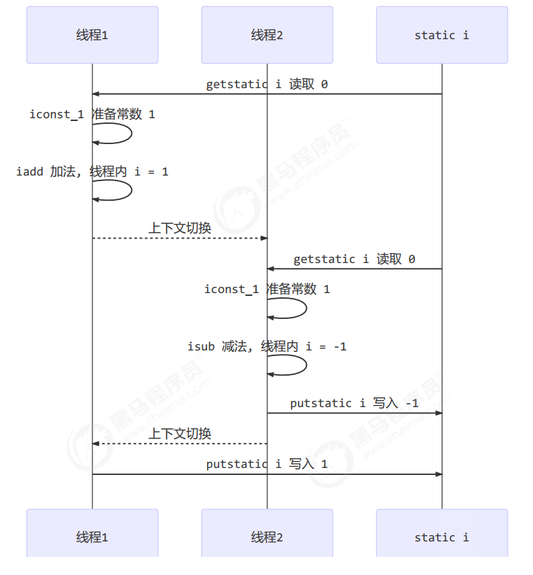- 假设一个线程取到数据,并进行i++操作之后,但并未将数据放入时,发生了上下文转换,这时另一个线程完成了i--操作