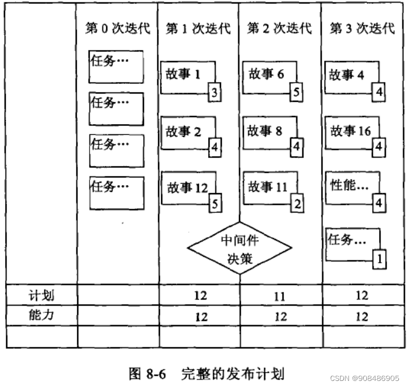 | 8.6.6 其他故事类型 | 尽管发布计划中80%-90% 的故事应该都是面向客户的故事,但不要忘记还有另外 1. 维护故事 维护和改进请求(SCR)可以列为故事(故事可以是一个SCR 集合),然后和新的开发工作一样列入选代计划中,唯一变化的是功能清单的属性。 2. 任务卡片 故事计划优先于任务计划并不意味着可以完全掏汰任务。 3. 变更卡片 4. 团队间职责协议卡片 团队间职责协议卡片用于在大型项目(有多个团队)中记录-个团队承诺为项目组内的另一个团队所做的工作。 5. 决策里程碑 不管任何项目敏捷与否,都需要监控决策点,这样做的关键在于提高项目的敏捷性。