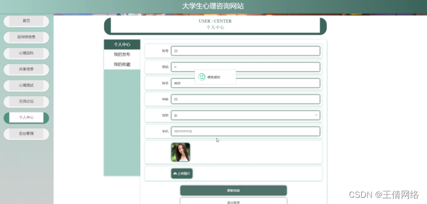 4、主页内容管理:管理员登录以后,可以对个人中心、学生管理、咨询师管理、咨询师信息管理、心理百科管理、在线咨询管理、网上预约管理、共享信息管理、心理测试管理、测试报告管理、交流论坛、系统管理进行详细操作。