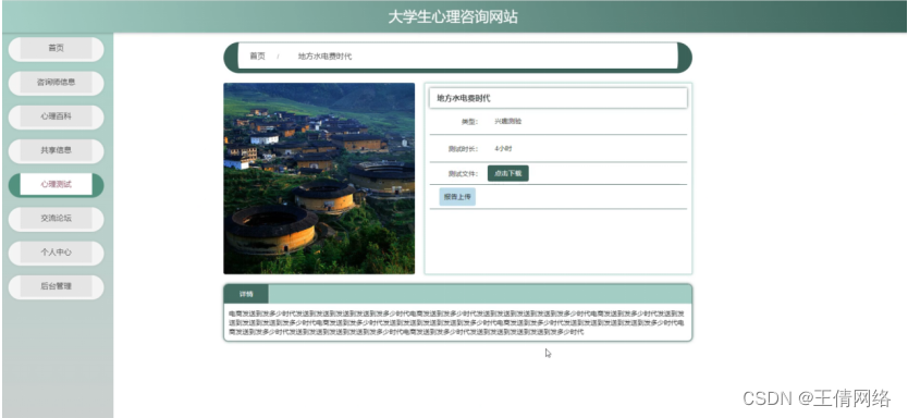 心理测试,在心理测试页面可以查看标题、类型、测试文件、测试时长、封面、详情等详细内容,根据需要进行报告上传操作,如图5-7所示。