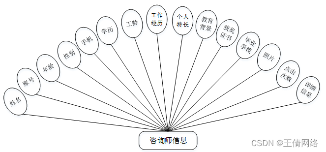咨询师信息实体包括姓名、账号、年龄、性别、手机、学历、工龄、工作经历、个人特长、教育背景、获奖证书、毕业学校、照片、点击次数、详细信息等属性;咨询师信息实体图如图4-3所示:
