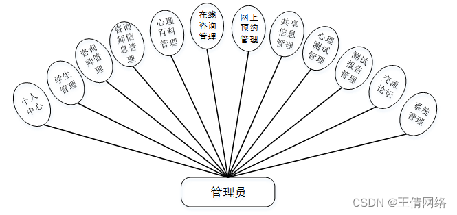 (3)管理员模块中的用户角色是管理员,管理员通过系统对可以实现网站系统管理,主要包括个人中心、学生管理、咨询师管理、咨询师信息管理、心理百科管理、在线咨询管理、网上预约管理、共享信息管理、心理测试管理、测试报告管理、交流论坛、系统管理等功能。管理员模块用例图如图3-3所示。