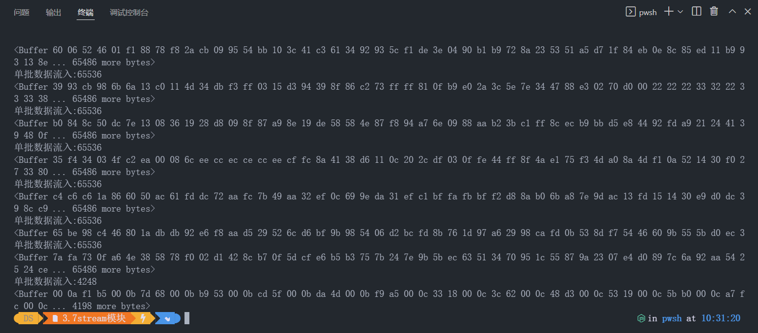 console.log('单批数据流入:' + chunk.length);