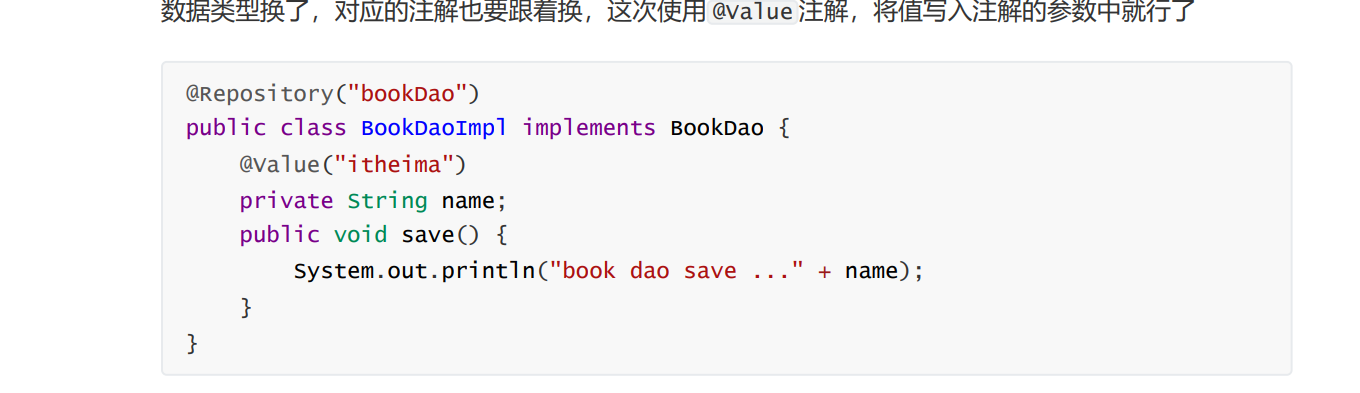 package org.example.Dao; public class BookDaoImpl implements BookDao{ private String name; public void setName(String name) { this.name = name; } public void save() { System.out.println("book dao save ..." + name); } } package org.example.Dao; public interface BookDao {public void save(); } @Test public void alibbTest() { ApplicationContext ctx = new ClassPathXmlApplicationContext("applicationContext.xml"); //getBean()需要注入项的id DataSource dataSource = (DataSource) ctx.getBean("dataSource"); System.out.println(dataSource); }最佳实践