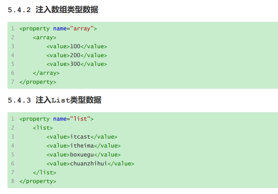 第2点在里面写入集合标签比如咱常见的array list、map set还有我们的properties List set array在标签内部使用value引入各个值, 而map使用entry里面有两个属性一个T一个value分别对应键和值,最后就是咱最常见的properties类型数据里面用专有标签prop