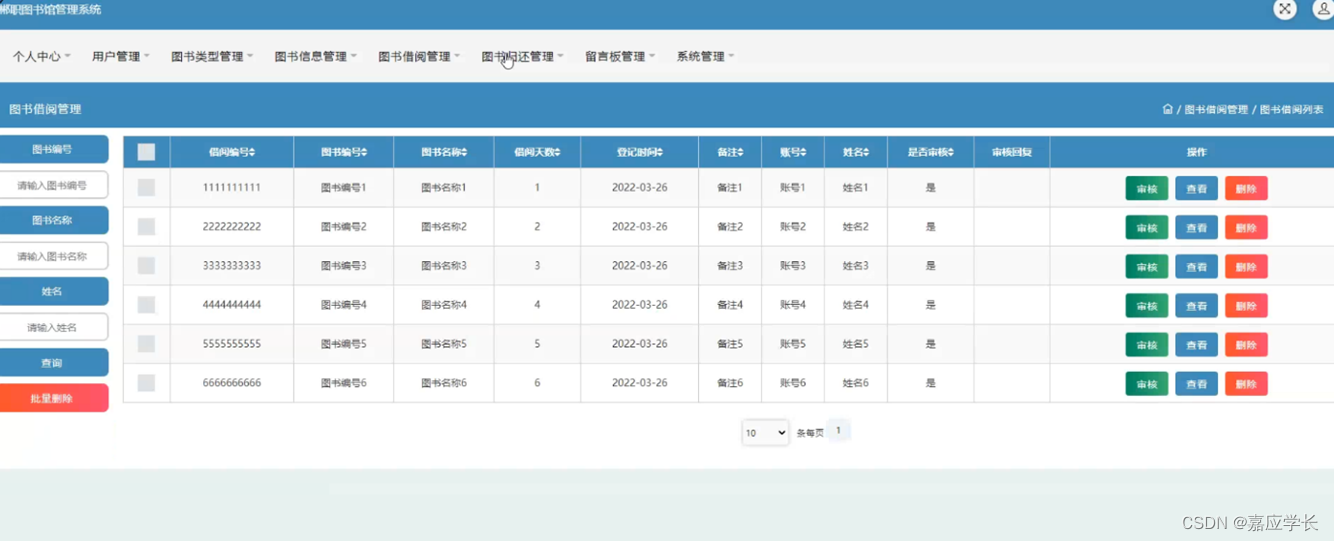 图书借阅管理,在图书借阅管理页面可以对借阅编号,图书编号,图书名称,借阅天数,登记时间,备注,账号,姓名,是否审核,审核回复等内容进行审核,查看和删除操作,如图5-10所示。