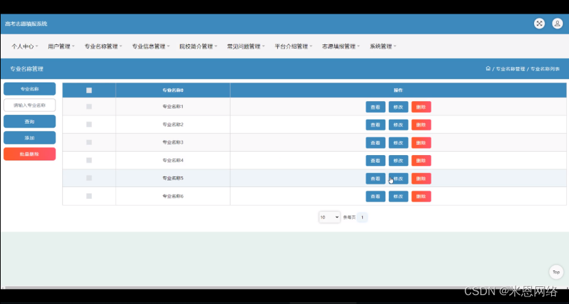 专业名称管理,在专业名称管理页面可以对专业名称等内容进行查看,修改和删除等操作,如图5-9所示。