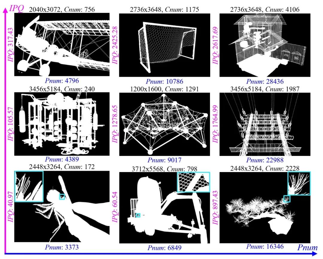 测试集:共计2000张图像,分为四个子集,测试难度级别依次递增。具体来说,首先将2000幅测试图像按照其结构复杂性IPQ和边界复杂性Pnum的乘积 (IPQ × Pnum) 升序排序。然后,将 DIS-TE分为4个子集 (即, DIS-TE1∼DIS-TE4),每个子集包含500张图像,代表4个测试难度等级。