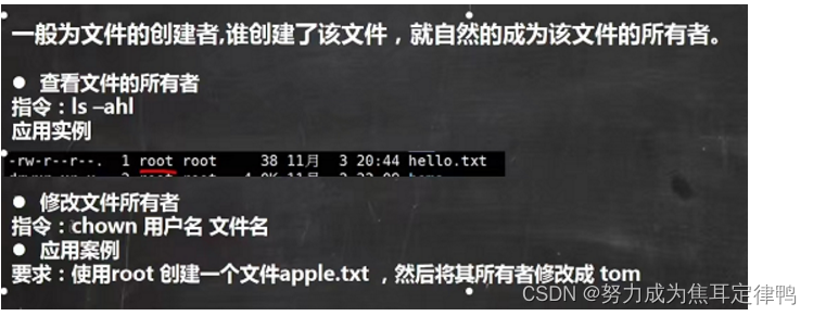 案例:使用root创建一个文件apple.txt,然后将其所有者修改为tom,操作如下: