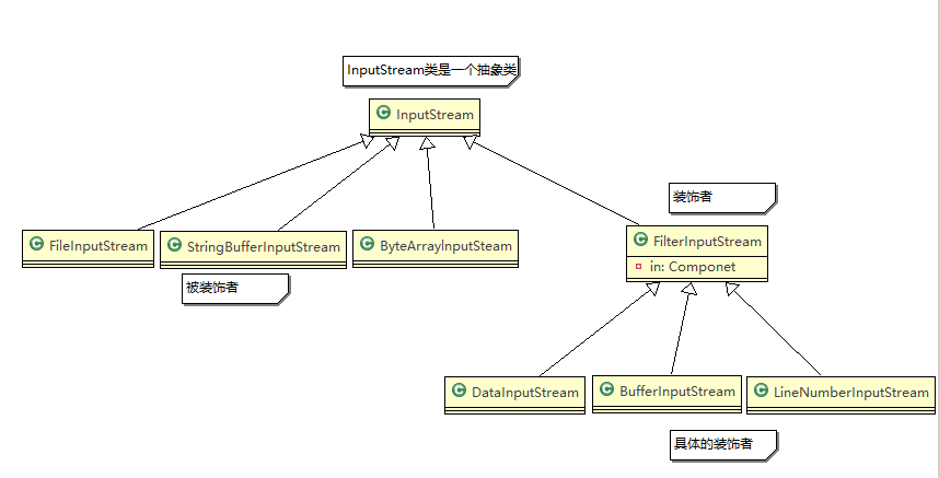 //3. FilterInputStream 是装饰者,是InputStream的子类,类似方案3中的Decorator。在FilterInputStream类中有一个InputStream类的成员属性in,即 FilterInputStream 含有 被装饰者。