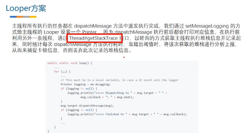 Thread#getStackTrace的接口来拿到我们当前卡顿的时候 我们的方法 我们的程序正在执行哪些方法。这就是捕获我们卡顿的时候执行的堆栈信息,从而去分析我们卡顿问题的原因