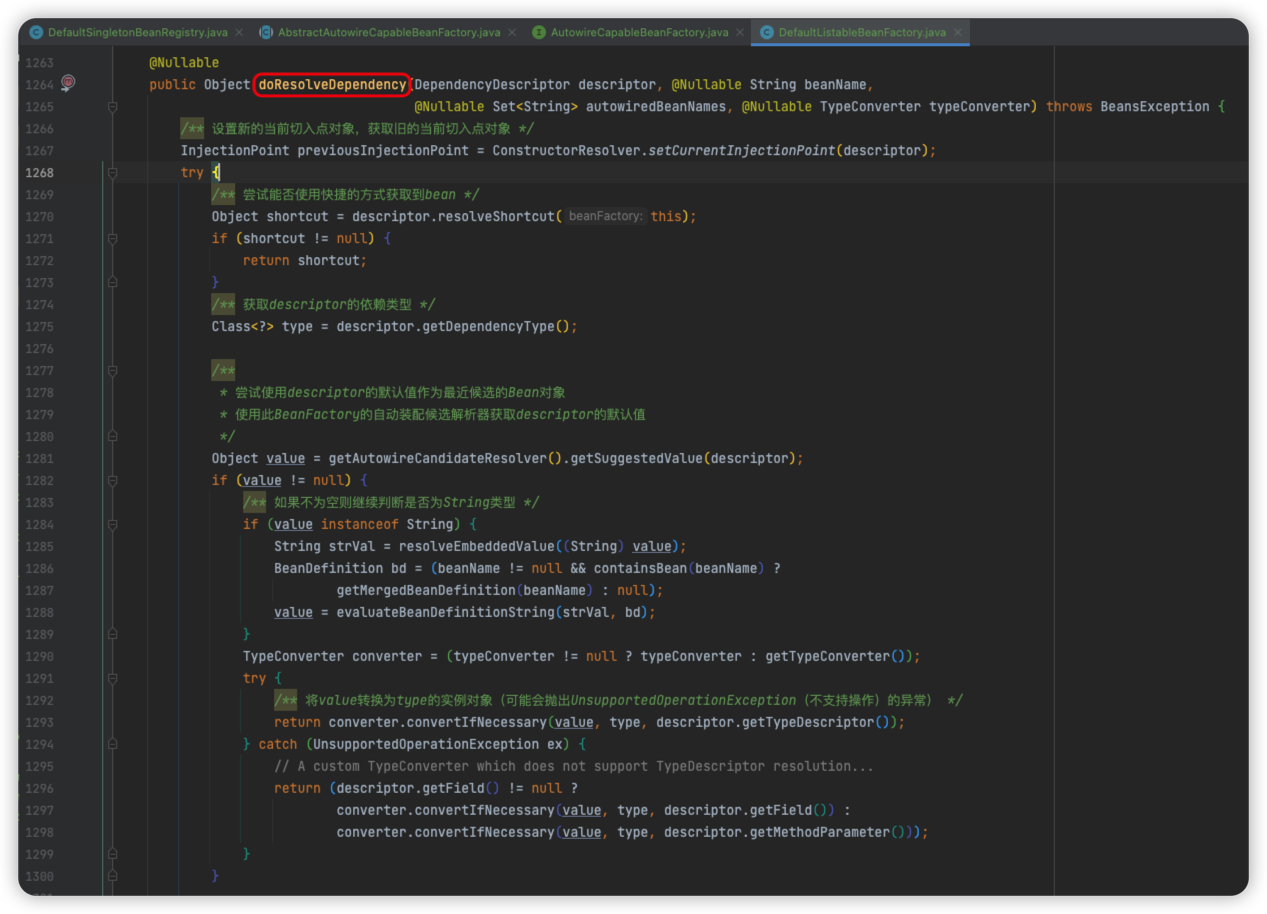 从上图我们可以看到,autowiredBeanNames在序号1处被定义成了一个空集合,在序号2处作为参数传入方法resolveDependency()中,序号3处被遍历,序号4处清空,所以autowiredBeanNames中的值只能是在方法resolveDependency()中被添加的 resolveDependency() 进入方