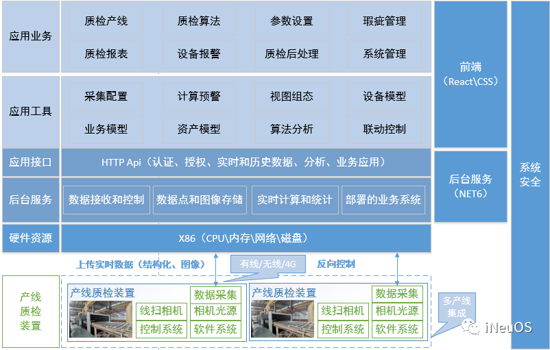 基于工业互联网的刨花板智能质检一体化系统包括产线质检装置、硬件资源、后台服务、应用接口、应用工具及应用业务。框架如下图: