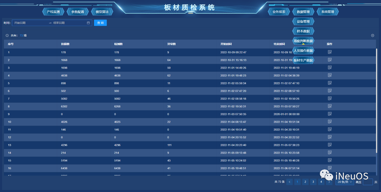 平台端的一体化管理系统支持多条刨花板产线进行在线监控与管理,实现瑕疵数据、产线状态数据、硬件状态数据等结构化数据管理、配方管理和图片数据管理。