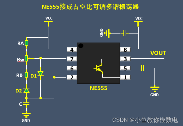 大家通过这个占空比的公式可以看到,这个方波的占空比是固定,不可调的,为了得到可调的占空比我们需要把电容的充电路径和放电路径分开下。就得到如下的电路。