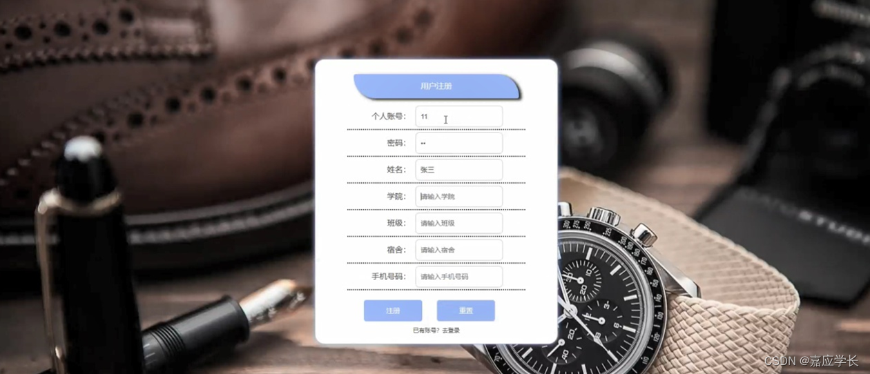 用户注册,在用户注册页面通过填写个人账号,密码,姓名,学院,班级,宿舍,手机号码等信息完成用户注册操作,如图5-2所示。