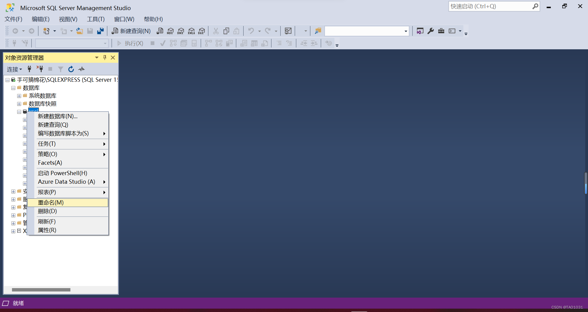 在“对象资源管理器”窗口中展开“数据库”,选择要重命名的数据库,单击鼠标右键,在弹出的快捷菜单中选择“重命名”菜单项,输入新的数据库名称。