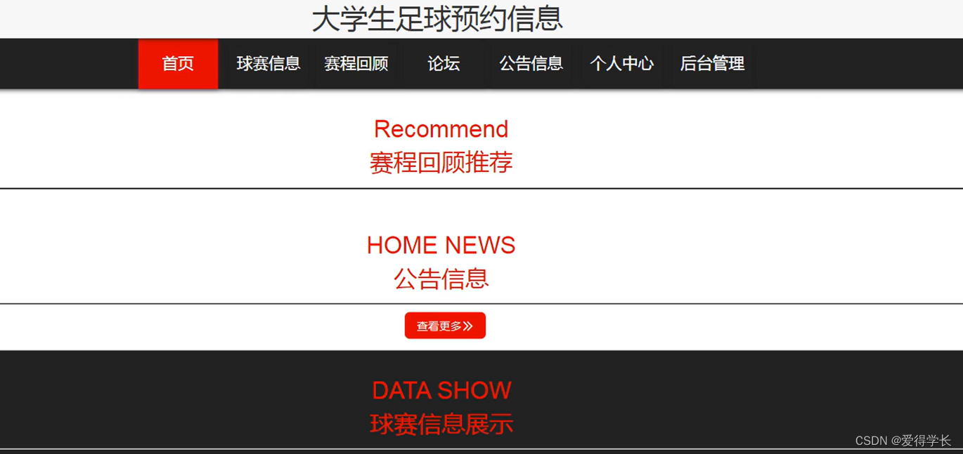 系统首页;进入大学生足球预约信息可以查看首页、球赛信息,赛程回顾,论坛,公告信息,个人中心,后台管理等功能进行详细操作,如图5-3所示。