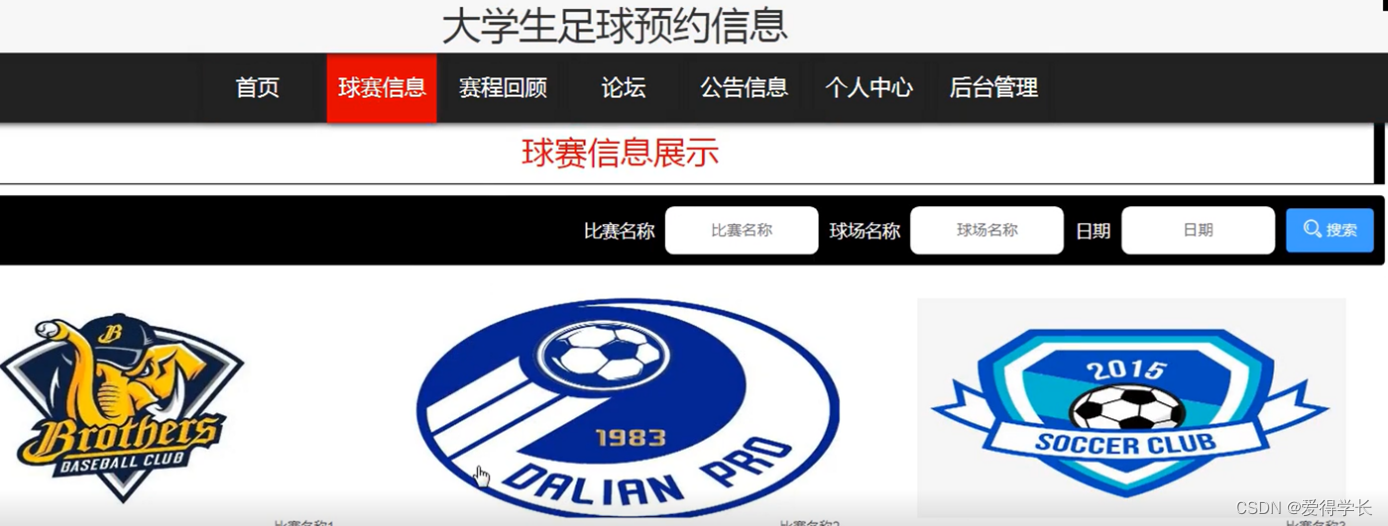 系统主要包括系统首页、球赛信息,赛程回顾,论坛,公告信息,个人中心,后台管理等功能模块。