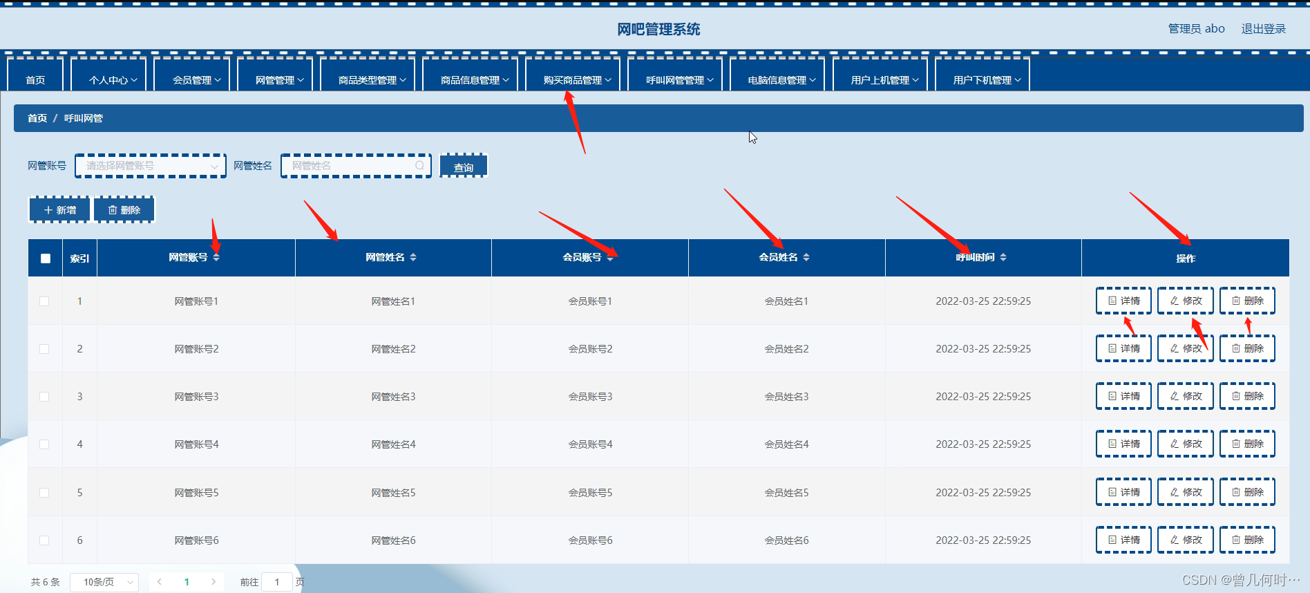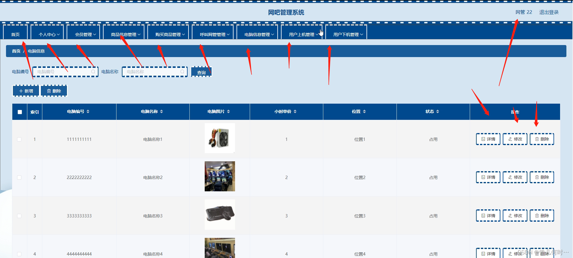 (3)网管:首页、个人中心、商品信息管理、购买商品信息管理、呼叫网管管理、电脑信息管理、用户上机管理、用户下机管理 。