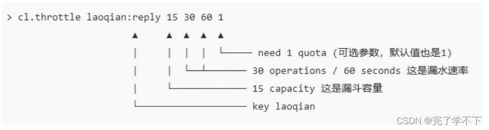上面这个指令的意思是允许「用户老钱回复行为」的频率为每 60s 最多 30 次(漏水速 率),漏斗的初始容量为 16,也就是说一开始可以连续回复 16 个帖子,然后才开始受漏水速率的影响。我们看到这个指令中漏水速率变成了 2 个参数,替代了之前的单个浮点数。用 两个参数相除的结果来表达漏水速率相对单个浮点数要更加直观一些。