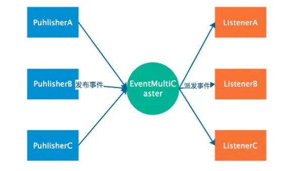 事件(ApplicationEvent):该类继承自 JDK 中的 EventObject,负责对应相应的监听器,事件源发生某事件是特定事件监听器被触发的原因;监听器(ApplicationListener):该类继承自 JDK 中的 EventListener,对应于观察者模式中的观察者。监听器监听特定事件,并在内部定义了事件发生后的响应逻辑;事件发布器(ApplicationEventPublisher):对应于观察者模式中的被观察者/主题,负责通知观察者,对外提供发布事件和增删事件监听器的接口,维护事件和事件监听器之间的映射关系,并在事件发生时负责通知相关监听器。通过上面的分析可以看出 Spring 的事件机制不仅是观察者模式的一种实现,也实现了 JDK 提供的事件接口。同时,除了发布者和监听者之外,还存在一个 EventMulticaster 的角色,负责把事件转发给监听者。